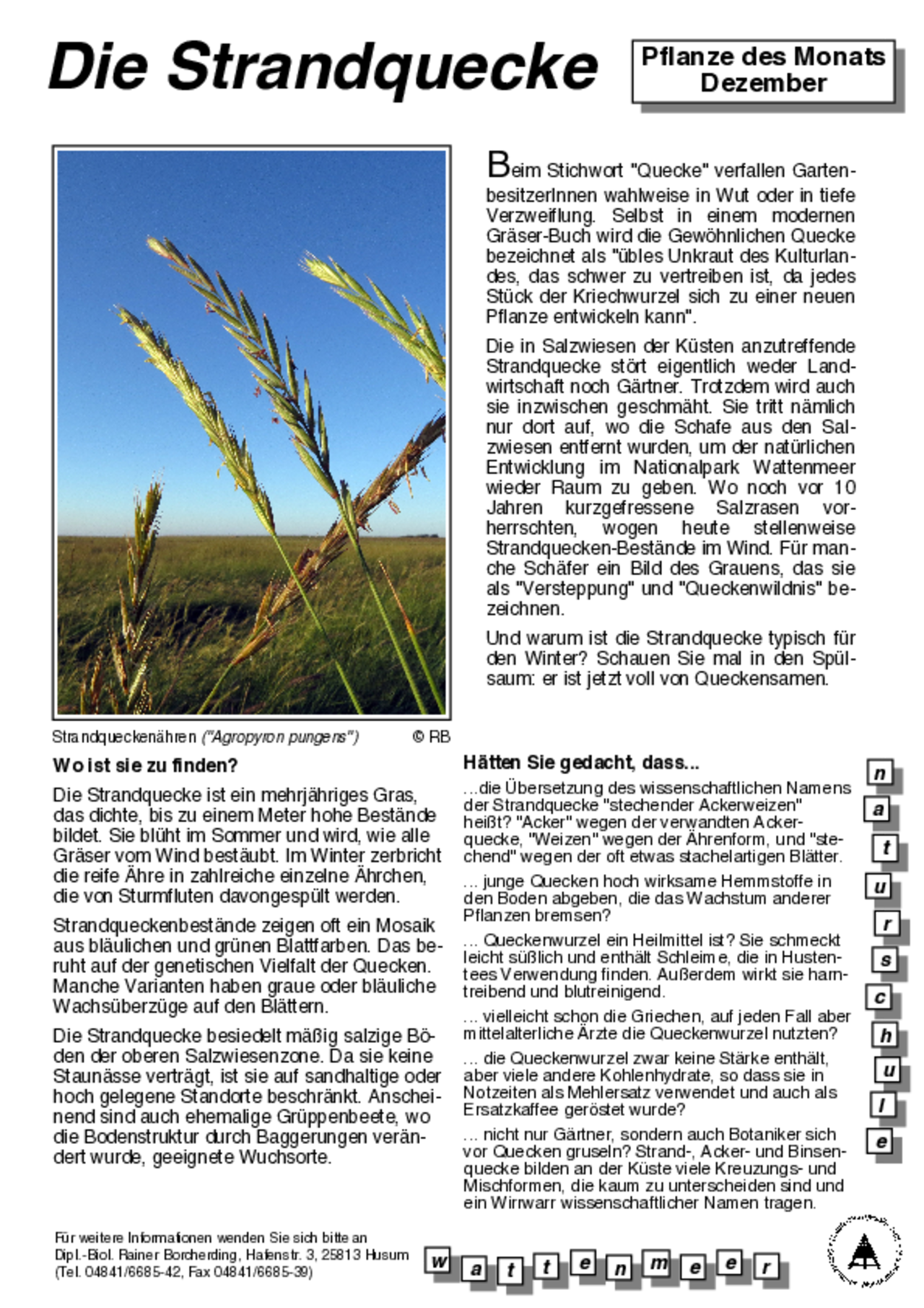 Die Strandquecke ist ein mehrjähriges Gras, das dichte, bis zu einem Meter hohe Bestände in der oberen Salzwiesenzone bildet. Da sie keine Staunässe verträgt, ist sie auf sandhaltige oder hoch gelegene Standorte beschränkt. Sie blüht im Sommer und lässt ihre Samen von Sturmfluten verbreitet.
