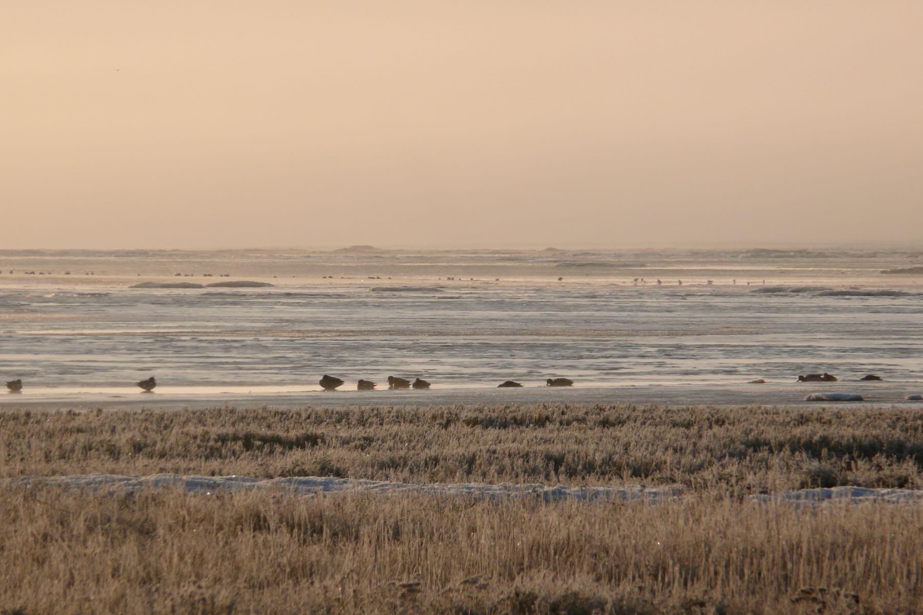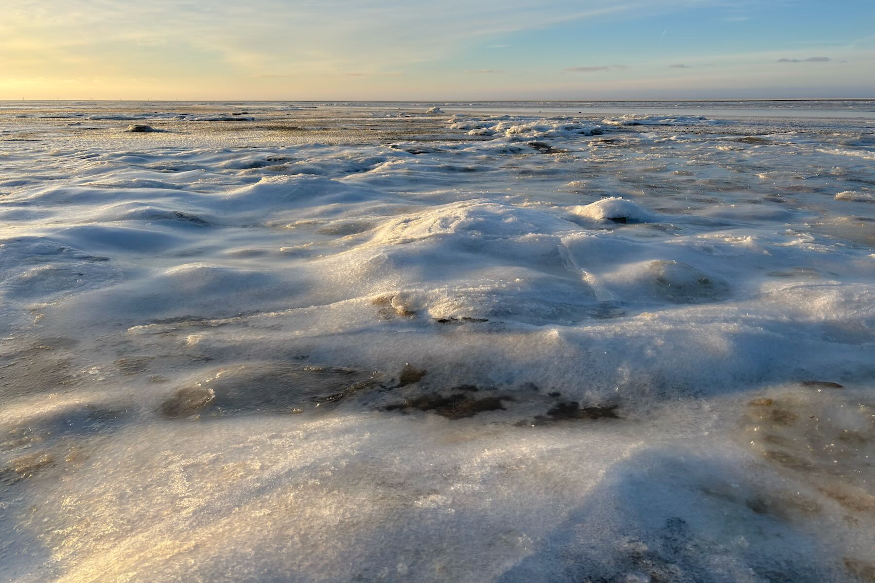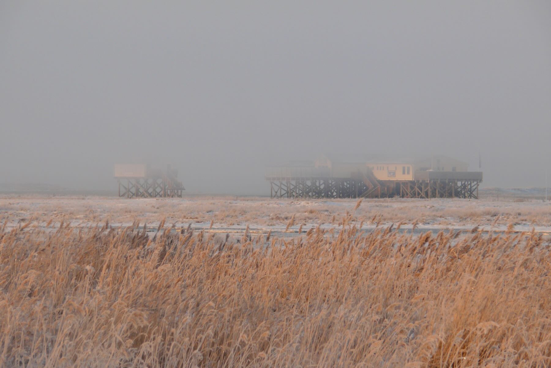 Schneefall und einige Frostnächte hatten das Wattenmeer schon Anfang der Woche winterlich wirken lassen. In der vergangenen Nacht sanken die Temperaturen vor St. Peter-Ording allerdings auf minus 11 Grad. Zu Schneeverwehungen in den Salzwiesen kamen nun innerhalb weniger Stunden große Eisflächen auf dem Watt, die von den Gezeiten bereits zu dickeren Schollen zusammengeschoben wurden. Zugleich zog immer wieder Nebel auf, der auch Gräser und andere Pflanzen mit glitzerndem Raureif schimmern ließ.