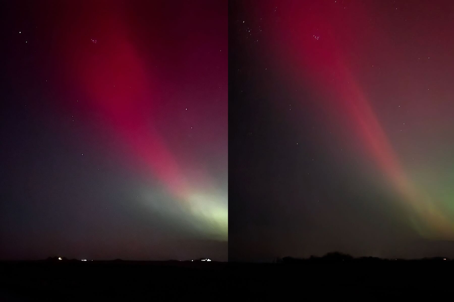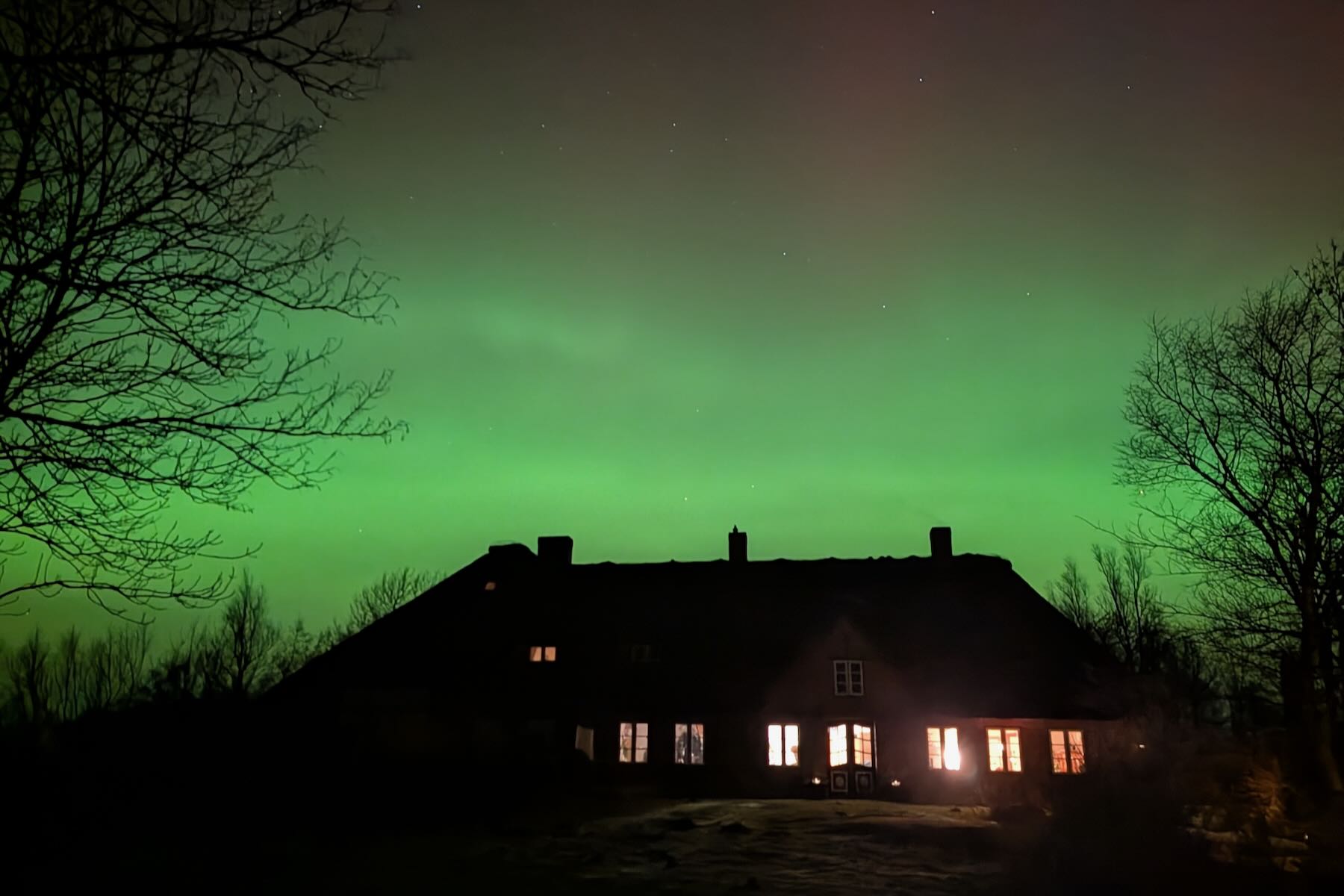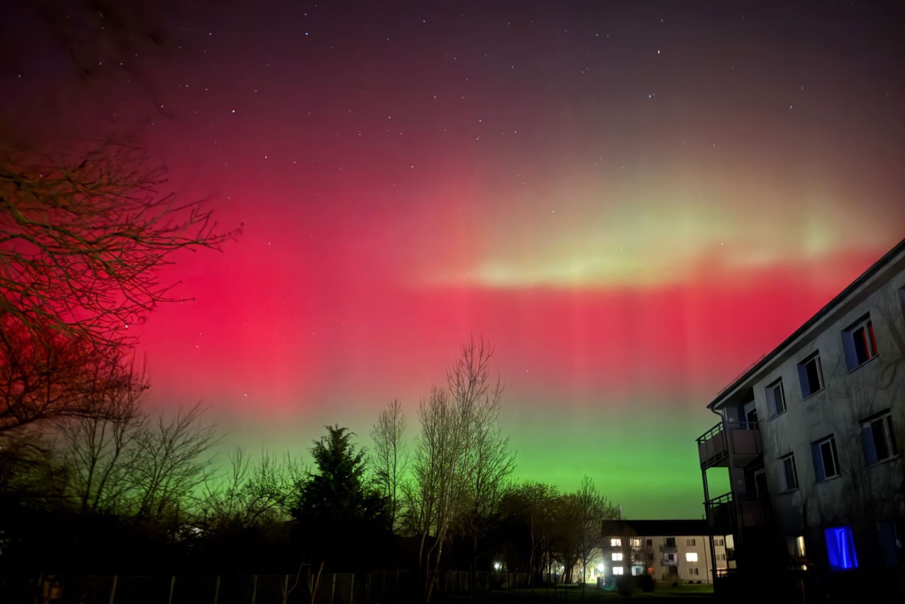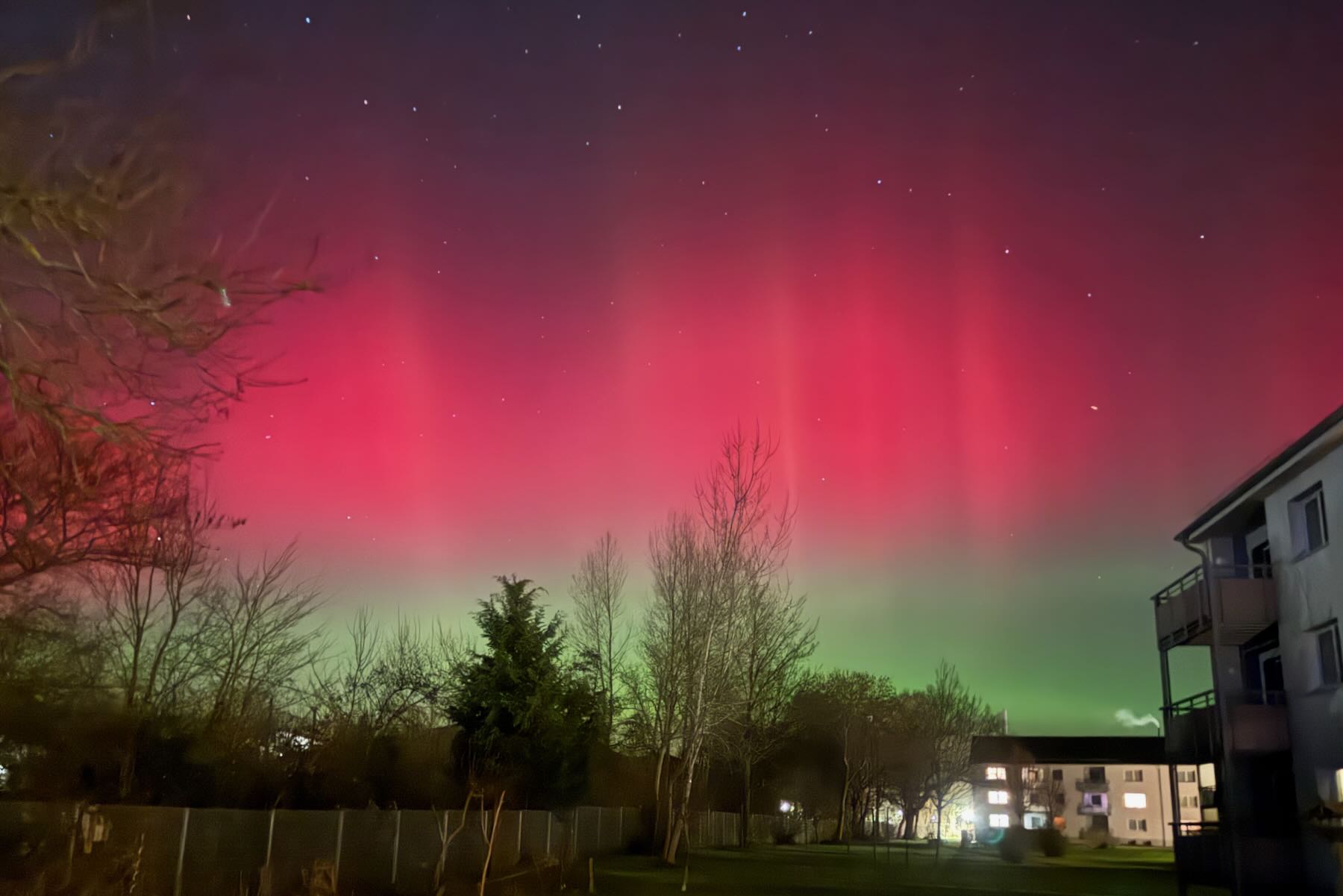 Am Abend des 20. Januar traf ein kräftiger Sonnensturm die Erde. Über ganz Deutschland waren intensiv strahlende Polarlichter in Grün- und Rottönen zu sehen. Leider “übertreiben” die Sensoren der Digitalkameras und Smartphones die Darstellung der Farben etwas. Mit bloßem Augen erschienen die Lichter nicht ganz so bunt.