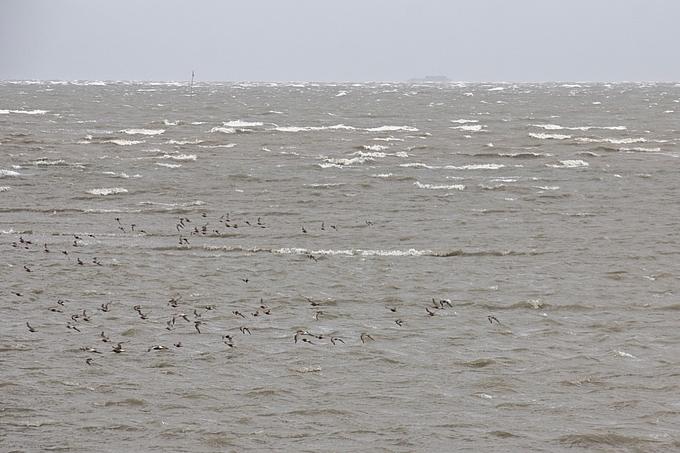 Die Rastplätze vieler arktischer Alpenstrandläufer, Knutts oder Pfuhlschnepfen auf Blauort- oder Süderoogsand sind jetzt überspült, so dass die Vögel in großen Schwärmen an das Festland oder auf die Inseln ausweichen. Bei Ebbe gibt das Wasser nur vergleichsweise kleine Wattflächen und nur für kurze Zeit frei. Entsprechend groß ist jetzt dort das Gedränge hungriger Vögel. Ersatzweise suchen viele auch auf den Deichen oder an den Spülsäumen nach Nahrung. Schließlich müssen sie sich eigentlich Fettreserven für den anstehenden Flug in ihre arktischen Brutgebiete anfuttern.