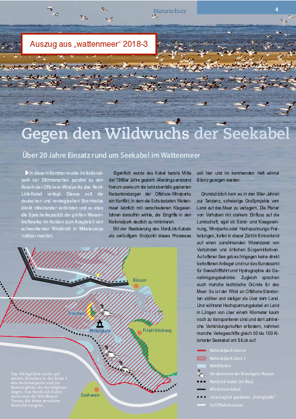 Eigentlich wurde dieses Kabel bereits Mitte der 1990er Jahre geplant. Allerdings entstand hierum sowie um die bald ebenfalls geplanten Netzanbindungen der Offshore-Windparks ein Konflikt, in dem die Schutzstation Wattenmeer letztlich mit verschiedenen Klageverfahren daraufhin wirkte, die Eingriffe in den Nationalpark deutlich zu minimieren. Mit der Realisierung des NordLink-Kabels als vorläufigem Endpunkt dieses Prozesses ziehen wir in zwei ausführlichen Berichten in der Zeitschrift "wattenmeer" einmal Bilanz.