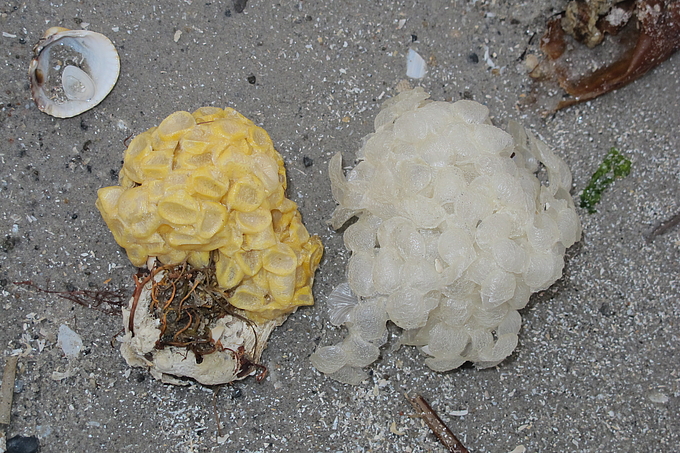 Wer im April nach einer hohen Flut am Spülsaum entlang geht, wundert sich vielleicht über apfelgroße gelbliche Klumpen, die vom Meer „ausgespuckt“ worden sind. Jeder Klumpen besteht aus zahlreichen, etwa einen Zentimeter großen Blasen. Deren meist gelblich-weiße Füllung sind winzige Eier. Sie stammen von der größten im Wattenmeer lebenden Meeresschnecke, der Wellhornschnecke.