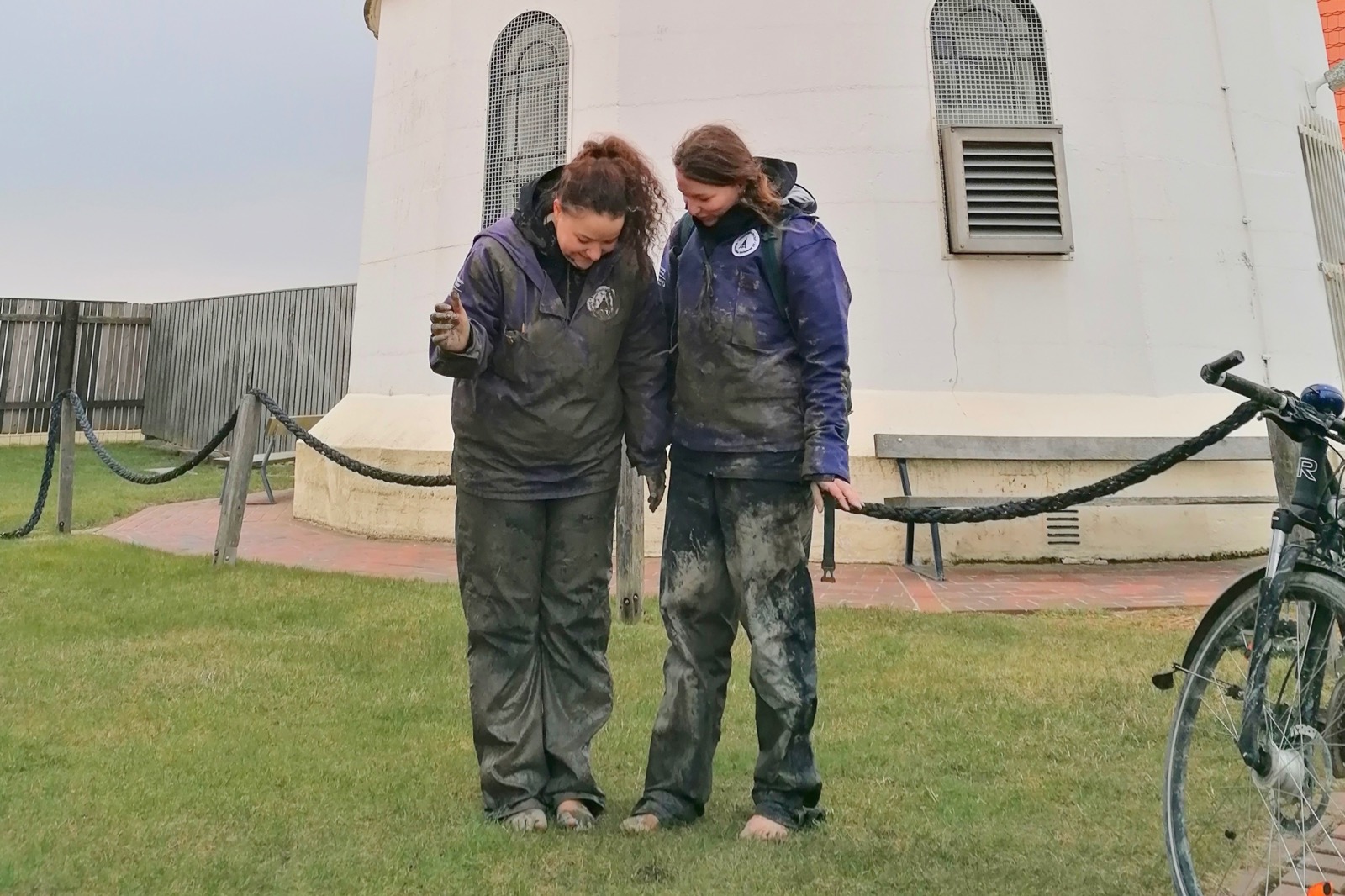Mit viel Elan sind zurzeit unsere Freiwilligen-Teams draußen im Watt unterwegs, um das Bodenleben am Ende des Winters zu erfassen. Oft ist es hierbei noch ziemlich kalt und nass, so dass die jungen Leute meist dick eingepackt in Stiefeln, Regenhosen und Wetterjacken an die Arbeit gehen.