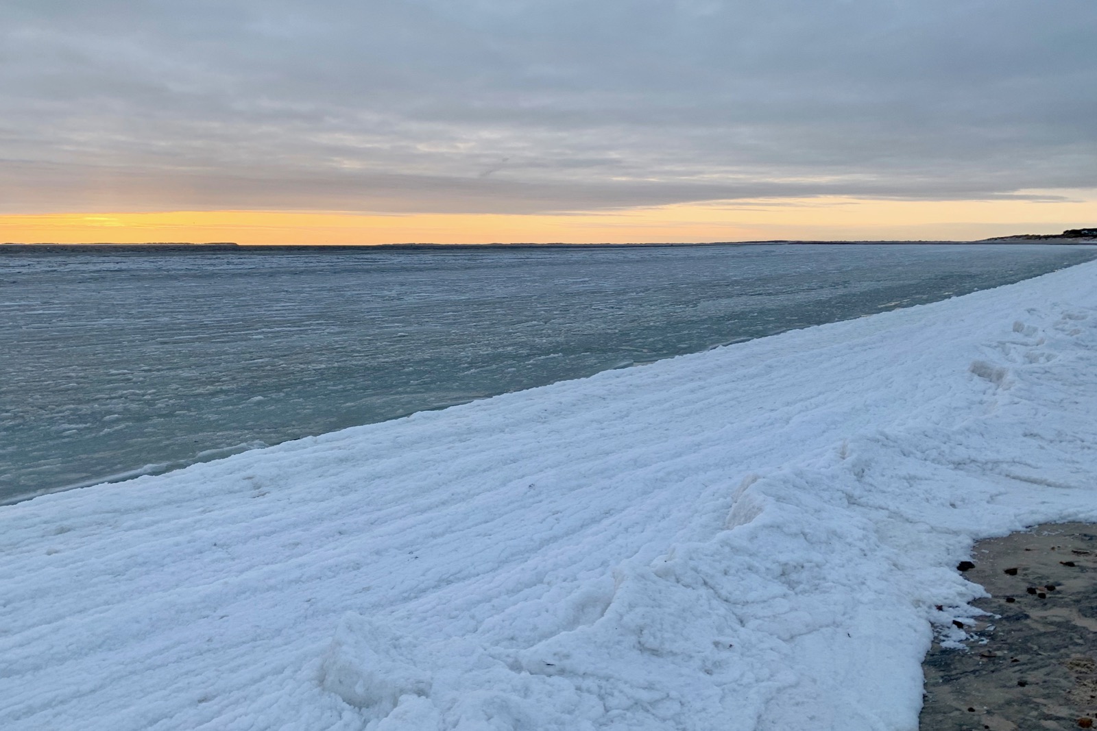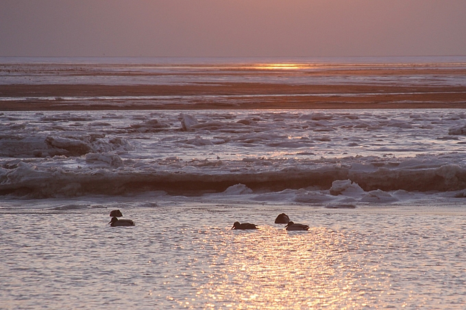 Andersherum behindern Eisschollen oft das Ablaufen der Ebbe. In sonst zur Niedrigwasserzeit längst trockenen Prielen kann man dann eine nasskalte Überraschung erleben. Also Vorsicht auf dem eisigen Watt.