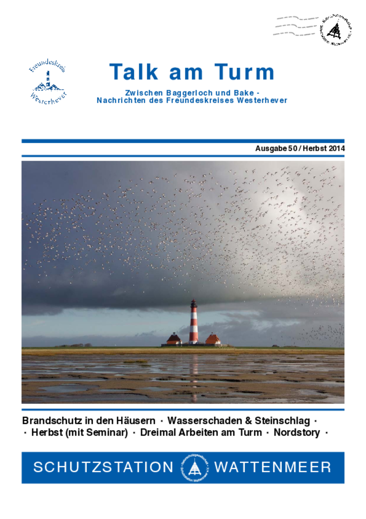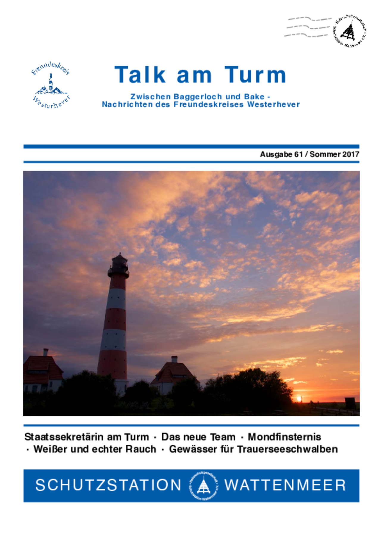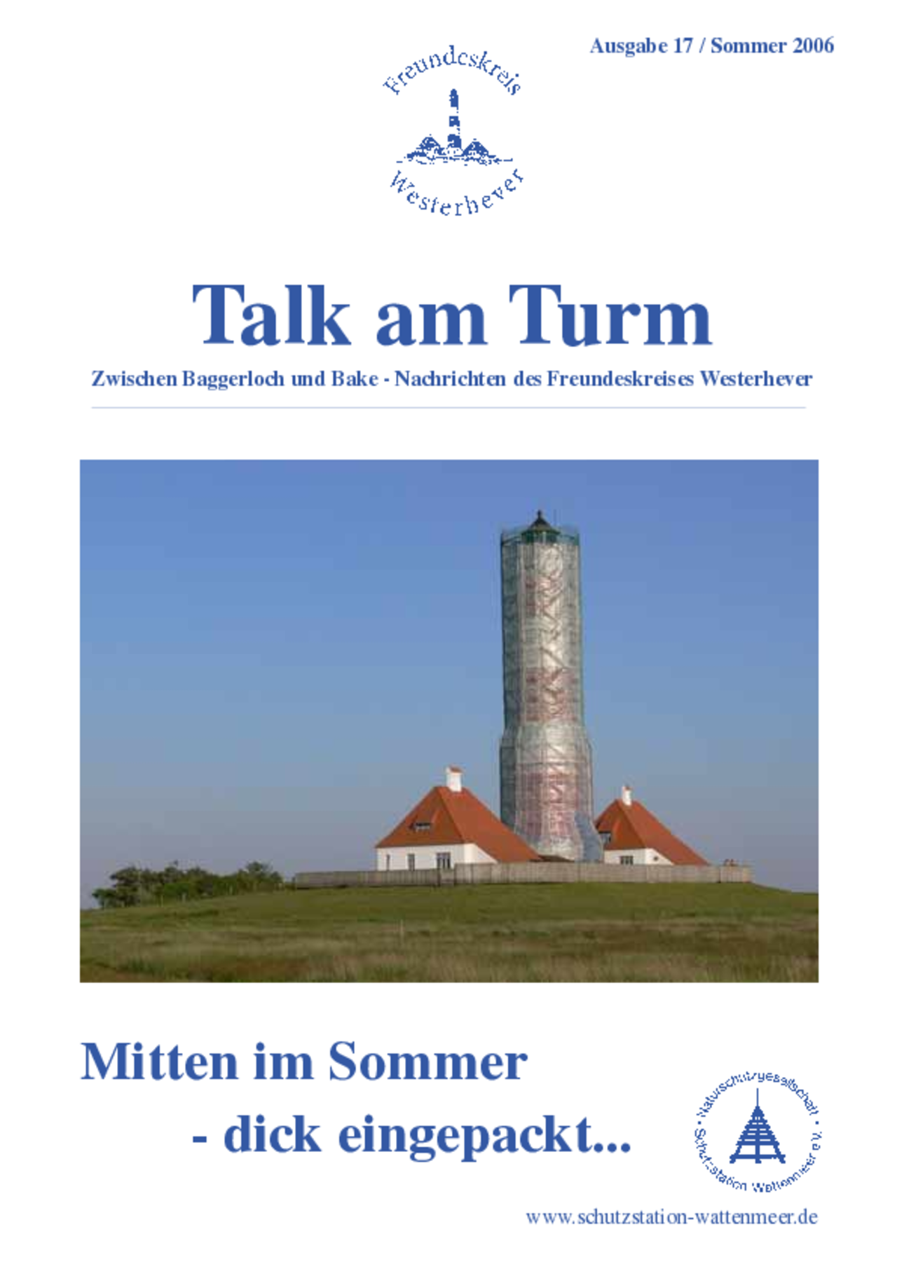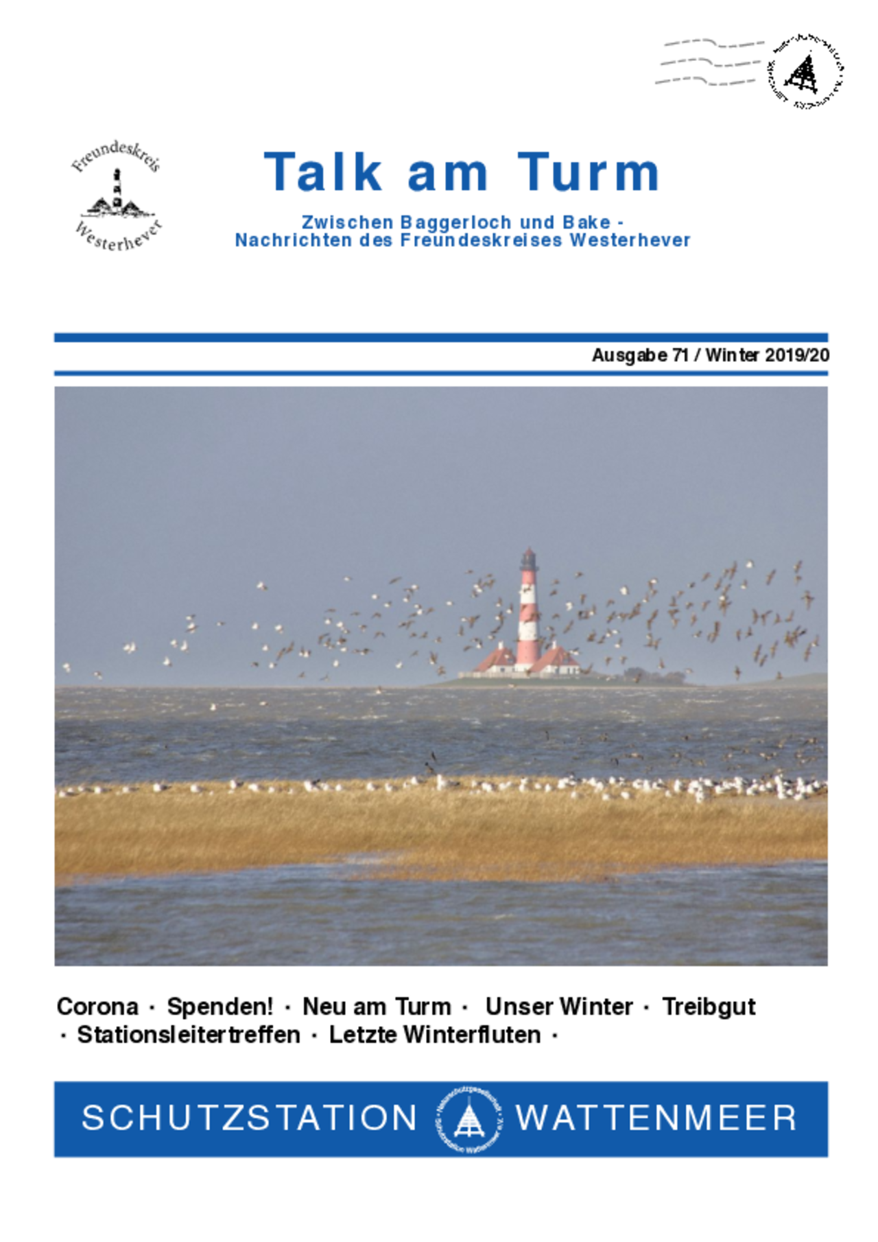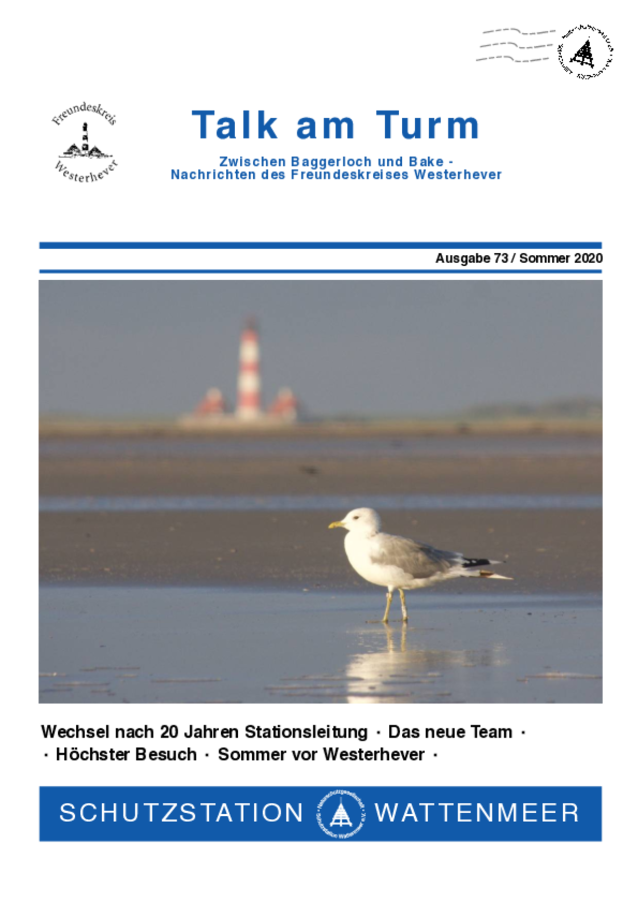 Der “Talk am Turm” berichtete knapp 20 Jahre lang auf ehrenamtlicher Basis über die Arbeit der Station Westerhever mit Zivildienstleistenden und Freiwilligen-Teams und die Kooperation mit verschiedenen Partnern vor Ort. Themen waren die Schutzgebietsbetreuung ebenso wie öffentliche Seminare, Werkwochen mit freiwilligen Helfer:innen oder die Natur des Nationalparks bis hin zu Sturmfluten und Eiswintern.