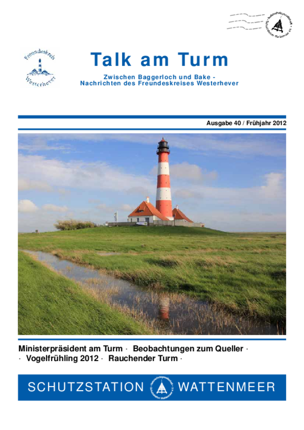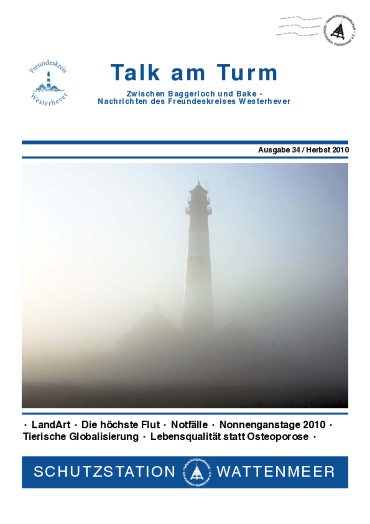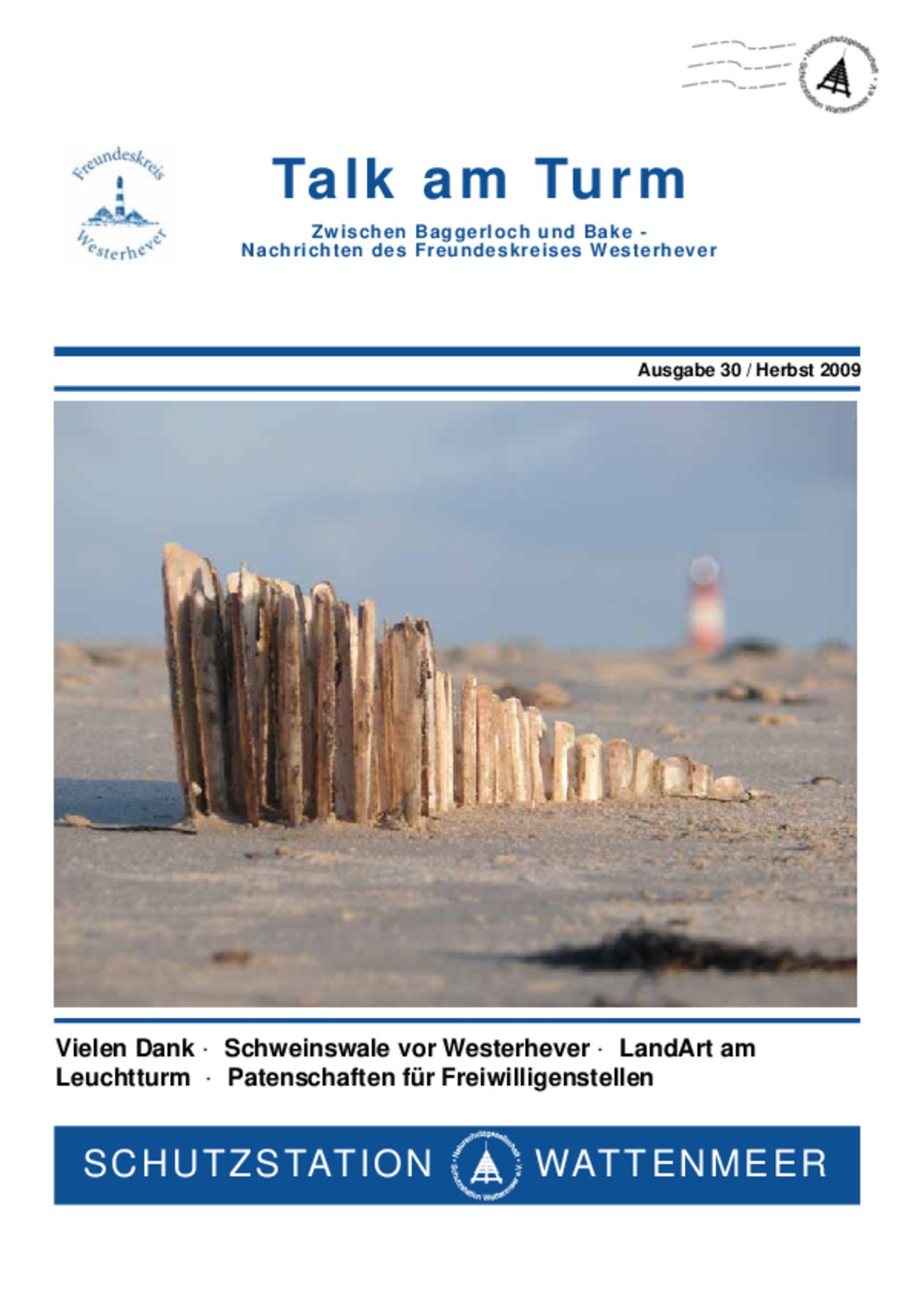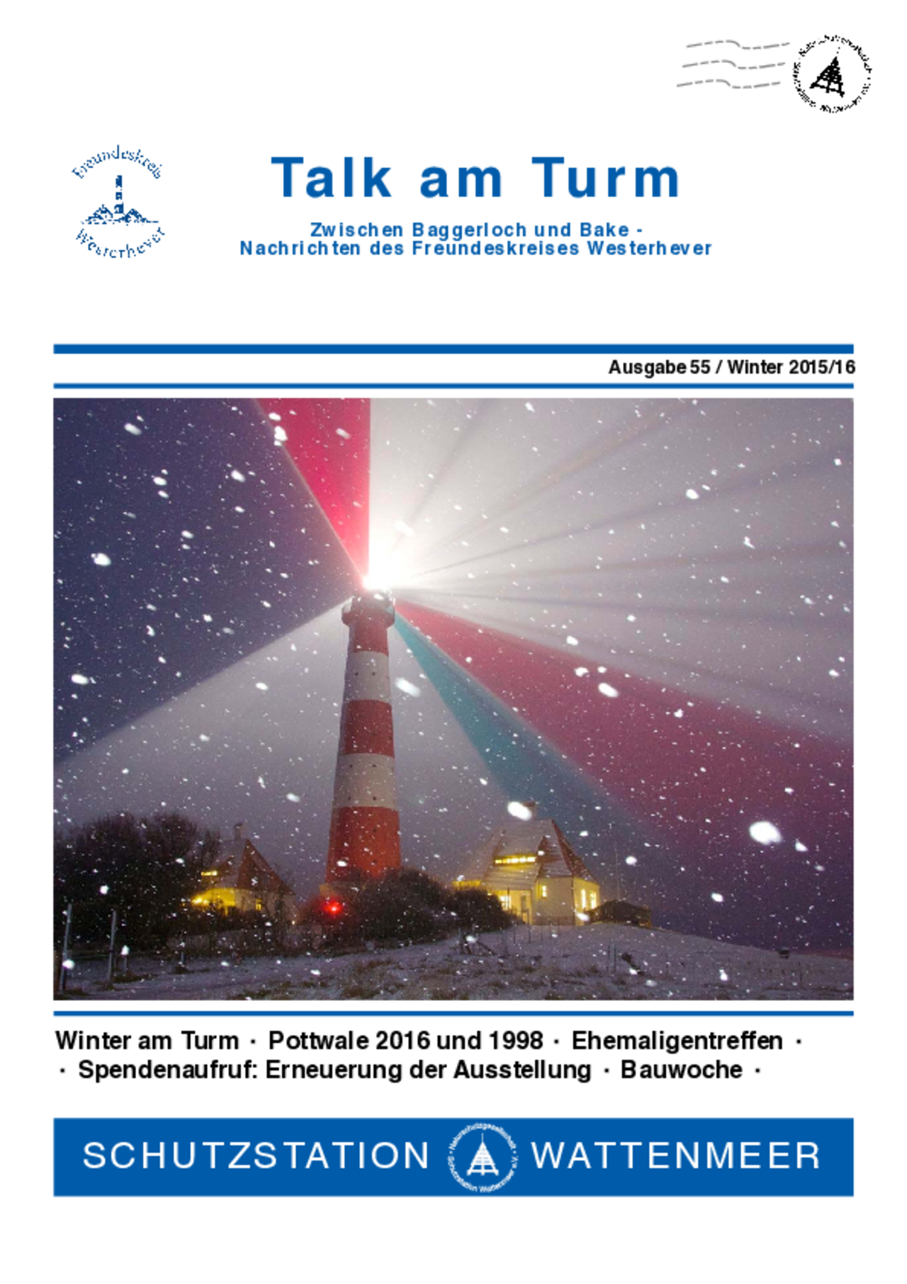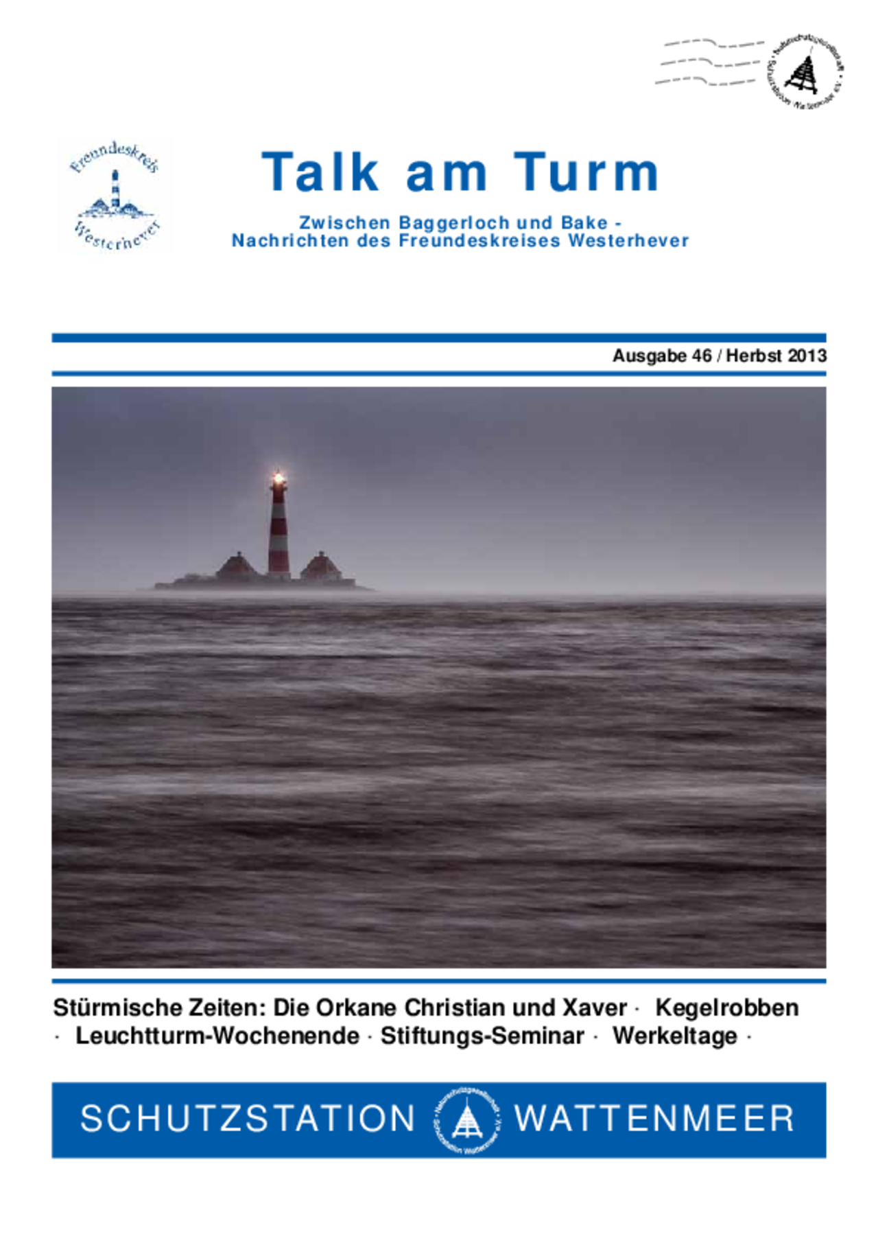 Der “Talk am Turm” berichtete knapp 20 Jahre lang auf ehrenamtlicher Basis über die Arbeit der Station Westerhever mit Zivildienstleistenden und Freiwilligen-Teams und die Kooperation mit verschiedenen Partnern vor Ort. Themen waren die Schutzgebietsbetreuung ebenso wie öffentliche Seminare, Werkwochen mit freiwilligen Helfer:innen oder die Natur des Nationalparks bis hin zu Sturmfluten und Eiswintern.