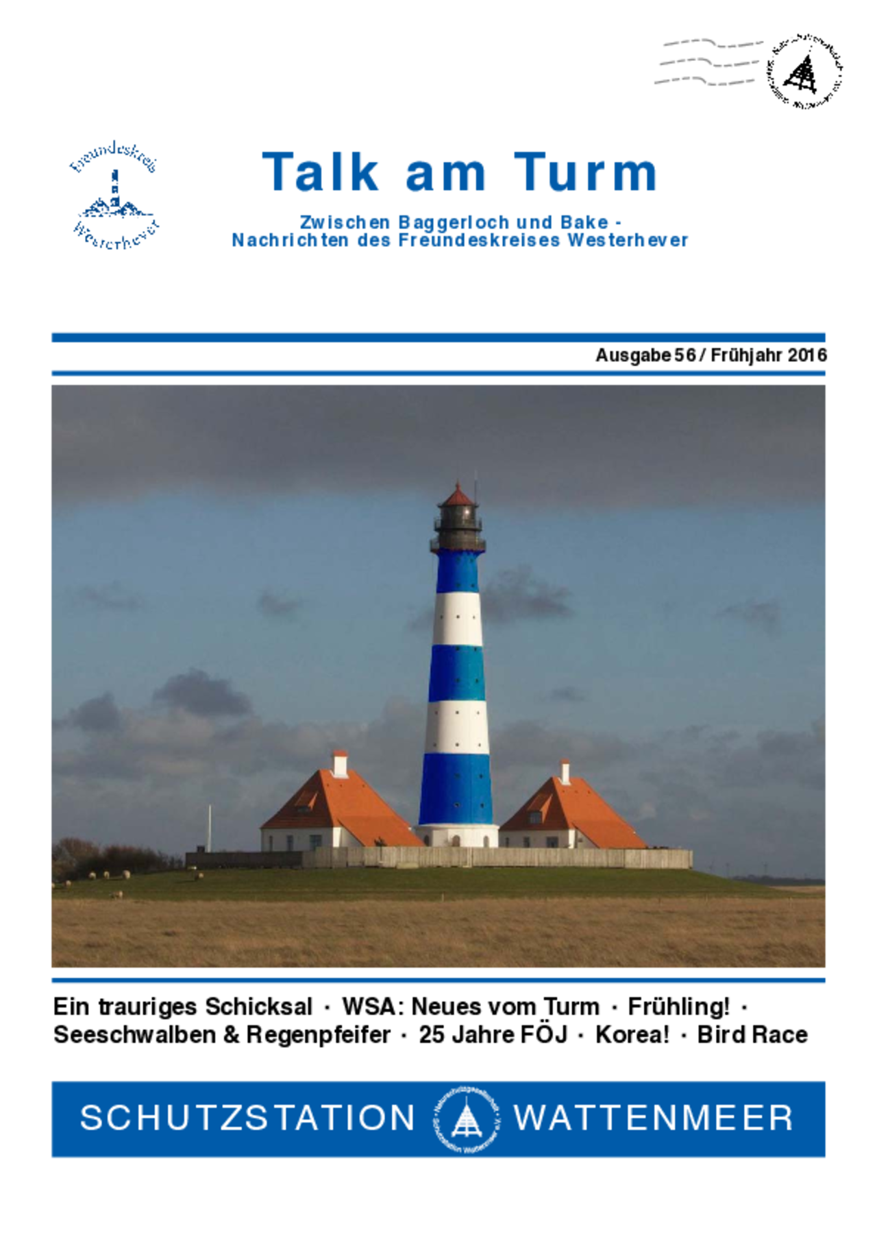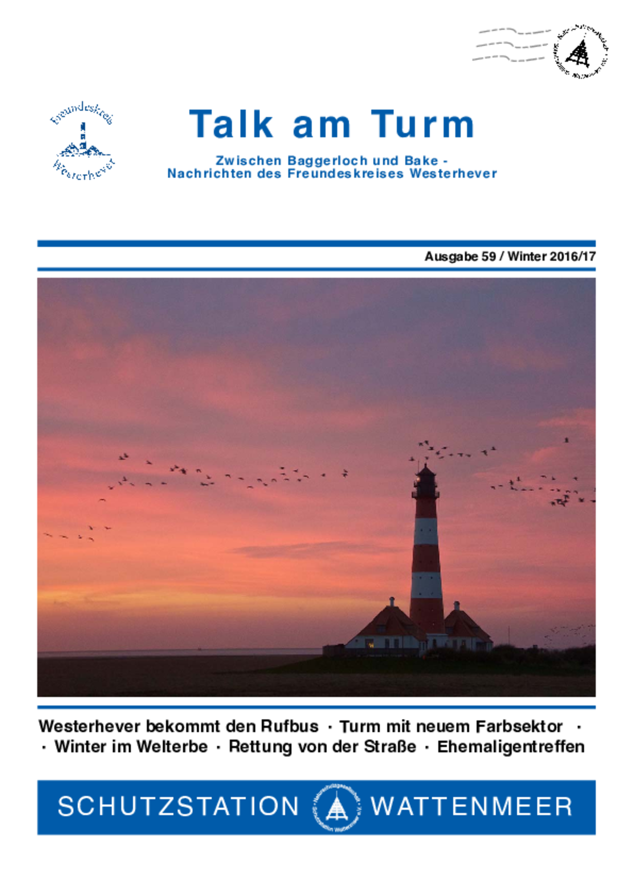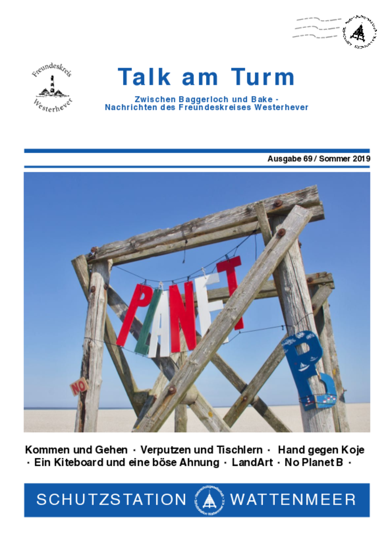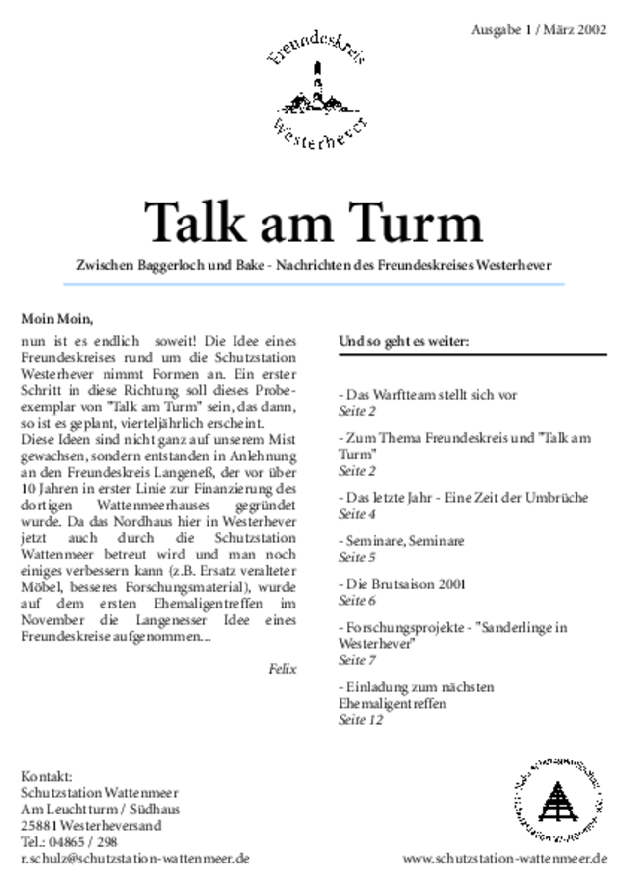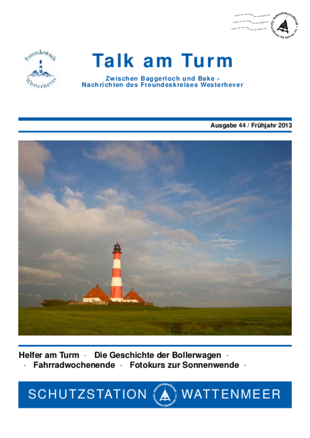 Der “Talk am Turm” berichtete knapp 20 Jahre lang auf ehrenamtlicher Basis über die Arbeit der Station Westerhever mit Zivildienstleistenden und Freiwilligen-Teams und die Kooperation mit verschiedenen Partnern vor Ort. Themen waren die Schutzgebietsbetreuung ebenso wie öffentliche Seminare, Werkwochen mit freiwilligen Helfer:innen oder die Natur des Nationalparks bis hin zu Sturmfluten und Eiswintern.
