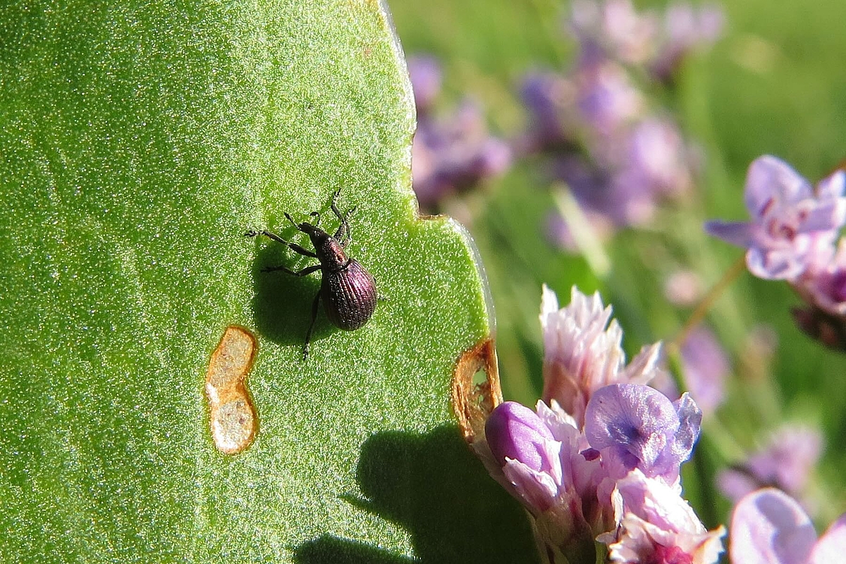 Mehr oder weniger lange Nasen bzw. Rüssel kennzeichnen die sehr artenreiche Gruppe der Rüsselkäfer. Spitzmausrüssler haben oft eine Kopfform, die mit etwas Phantasie an - genau - eine Spitzmaus erinnert. Und da viele Spitzmausrüssler an nur einer einzigen Pflanzenart leben, hat der Halligfliederspitzmausrüsselkäfer eigentlich einen sehr logischen und leicht zu merkenden Namen. Er ist 3 - 4 Millimeter lang, meist lila mit rotem oder goldenem Schimmer und ist im Sommer oft wegen seiner Fraßlöcher an Halligfliederblättern zu entdecken.